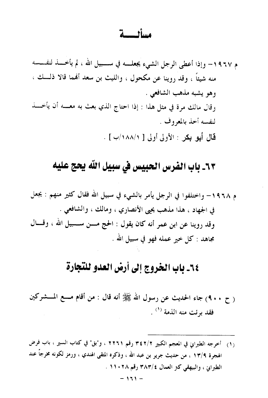 م 1967 - وإذا أعطى الرجل الشيء يجعله في سبيل الله، لم يأخذ لنفسه منه شيئاً، وقد روينا عن مكحول، والليث بن سعد أنهما قالا ذلك، وهو يشبه مذهب الشافعي.