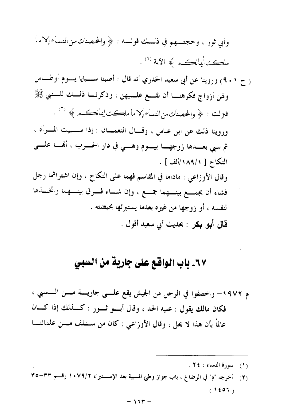 (ح 901) وروينا عن أبي سعيد الخدري أنه قال: أصبنا سبايا يوم أوطاس ولهن أزواج فكرهنا أن نقع عليهن، وذكرنا ذلك للنبى - صلى الله عليه وسلم - فنزلت: {وَالْمُحْصَنَاتُ مِنَ النِّسَاءِ إِلَّا مَا مَلَكَتْ أَيْمَانُكُمْ}.