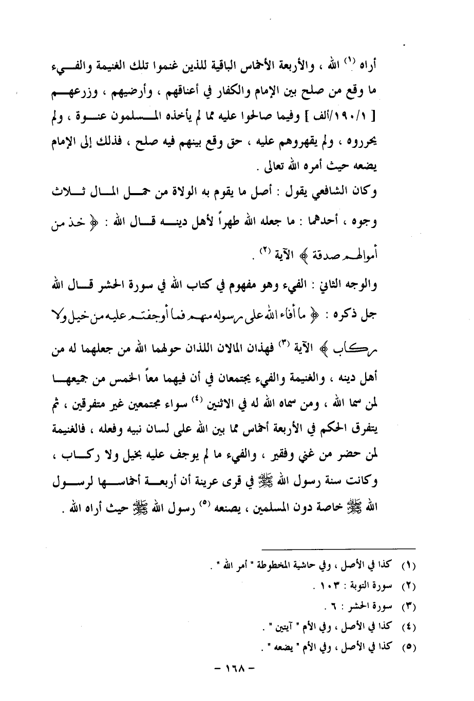 والوجه الثاني: الفيء وهو مفهوم في كتاب الله في سورة الحشر قال الله جل ذكره: {وَمَا أَفَاءَ اللَّهُ عَلَى رَسُولِهِ مِنْهُمْ فَمَا أَوْجَفْتُمْ عَلَيْهِ مِنْ خَيْلٍ وَلَا رِكَابٍ} الآية فهذان المالان اللذان حولهما الله من جعلهما له من أهل دينه، والغنيمة والفيء يجتمعان في أن فيهما معاً الخمس من جميعها لمن سما الله، ومن سماه الله له في الاثنين (¬2) سواء مجتمعين غير متفرقين، ثم يتفرق الحكم في الأربعة أخماس مما بين الله على لسان نبيه وفعله، فالغنيمة لمن حضر من غني وفقير، والفيء ما لم يوجف عليه بخيل ولا ركاب، وكانت سنة رسول الله- صلى الله عليه وسلم - في قرى عرينة أن أربعة أخماسها لرسول الله - صلى الله عليه وسلم - وخاصة دون المسلمين، يصنعه (¬3) رسول الله- صلى الله عليه وسلم - حيث أراه الله.