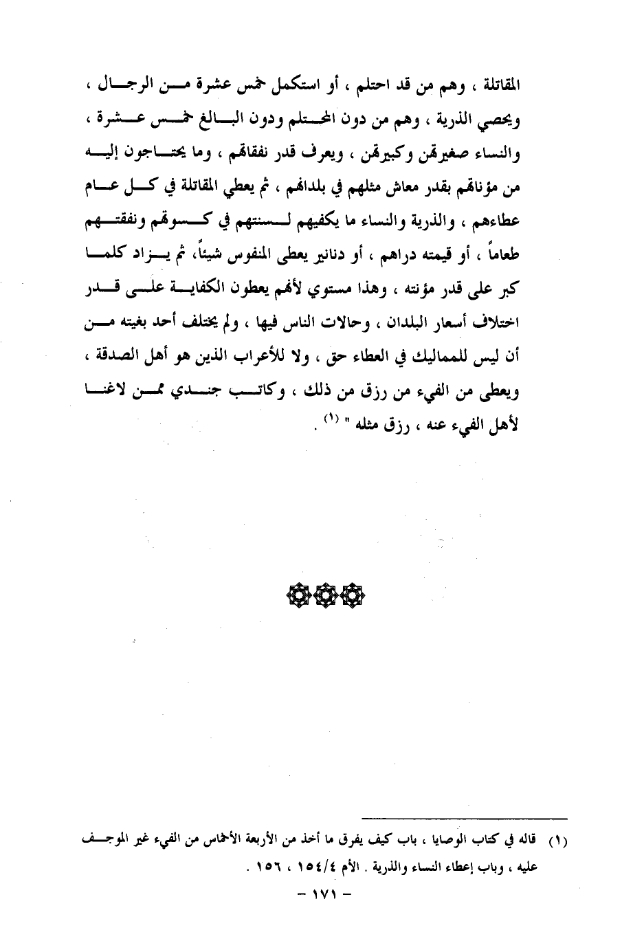 المقاتلة، وهم من قد احتلم، أو استكمل خمس عشرة من الرجال، ويحصي الذرية، وهم من دون المحتلم ودون البالغ خمس عشرة، والنساء صغيرتهن وكبيرتهن، ويعرف قدر نفقاتهم، وما يحتاجون إليه من مؤناتهم بقدر معاش مثلهم في بلدانهم، ثم يعطي المقاتلة في كل عام عطاءهم، والذرية والنساء ما يكفيهم لسنتهم في كسوتهم ونفقتهم طعاماً، أو قيمته دراهم، أو دنانير يعطى المنفوس شيئاً، ثم يزاد كلما كبر على قدر مؤنته، وهذا مستوي لأنهم يعطون الكفاية على قدر اختلاف أسعار البلدان، وحالات الناس فيها، ولم يختلف أحد بغيته من أن ليس للمماليك في العطاء حق، ولا للأعراب الذين هم أهل الصدقة، ويعطى من الفيء من رزق من ذلك، وكاتب جندى ممن لا غنا لأهل الفيء عنه، رزق مثله".