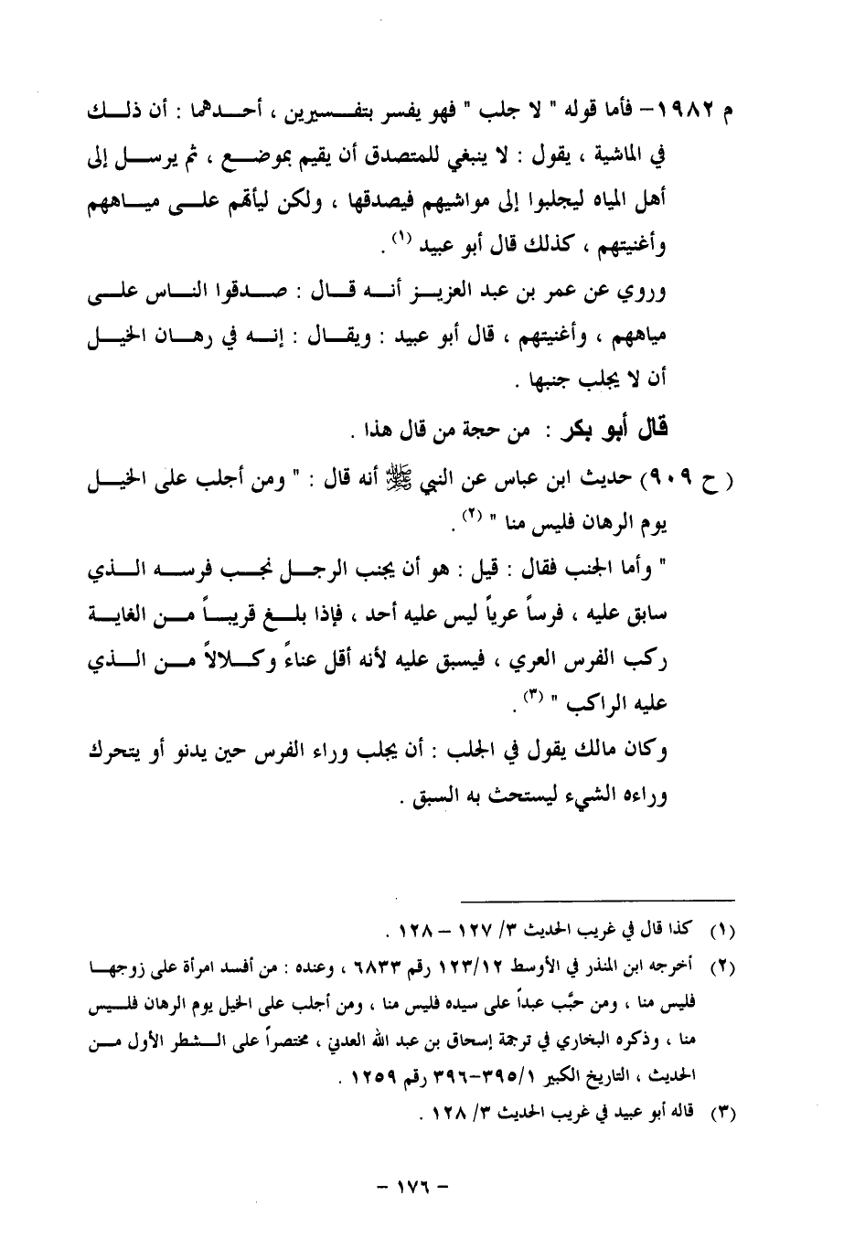 م 1982 - فأما قوله "لا جلب" فهو يفسر بتفسرين، أحدهما: أن ذلك في الماشية، يقول: لا ينبغي للمتصدق أن يقيم بموضع، ثم يرسل إلى أهل المياه ليجلبوا إلى مواشيهم فيصدقها، ولكن ليأتهم على مياههم وأغنيتهم، كذلك قال أبو عبيد.