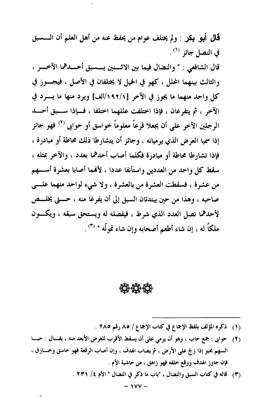 قال الشافعي: "والنضال فيما بين الاثنين يسبق أحدهما الآخر، والثالث بينهما المحلل، كهو في الخيل لا يختلفان في الأصل، فيجوز في كل واحد منهما ما يجوز في الآخر [1/ 192/ألف] ويرد منها ما يرد في الآخر، ثم يتفرعان، فإذا اختلفت عللهما اختلفا، فإذا سبق أحد الرجلين الآخر على أن يجعلا قرعاً معلوماً خواسق أو حوابى فهو جائز إذا سميا العرض الذي يرميانه، وجائز أن يتشارطا ذلك محاطة أو مبادرة، فإذا تشارطا محاطة أو مبادرة فكلما أصاب أحدهما بعدد، والآخر بمثله، سقط كل واحد من العددين واستأنفا عددا، لأنهما أصابا بعشرة أسهم من عشرة، فسقطت العشرة من بالعشرة، ولا شيء لواحد منهما على صاحبه، وهذا من حين يبتدئان السبق إلى أن يفرغا منه، حتى يخلص لأحدهما نصل العدد الذي شرط، فيفصله له ويستحق سبقه، ويكون ملكاً له، إن شاء أطعم أصحابه وإن شاء تموّله".