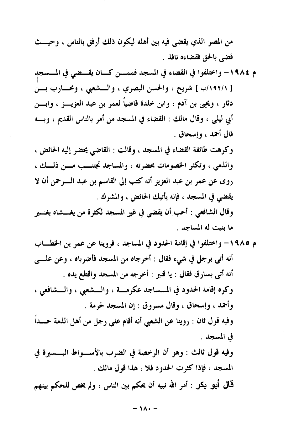 م 1984 - واختلفوا في القضاء في المسجد فممن كان يقضي في المسجد [1/ 192/ب] شريح، والحسن البصري، والشعبي، ومحارب بن دثار، ويحيى بن آدم، وابن خلدة قاضياً لعمر بن عبد العزيز، وابن أبي ليلى، وقال مالك: القضاء في المسجد من أمر بالناس القديم، وبه قال أحمد، وإسحاق.