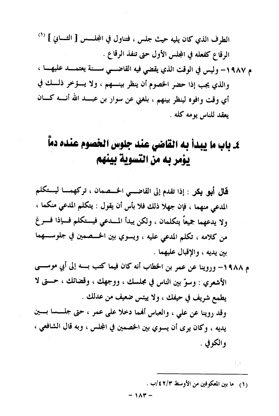 م 1987 - وليس في الوقت الذي يقضي فيه القاضي سنة يعتمد عليها، والذي يجب إذا حضر الخصوم أن ينظر بينهم، ولا يؤخر ذلك في أي وقت وافوه لينظر بينهم، بلغني عن سوار بن عبد الله أنه كان يعقد للناس يومه كله.
