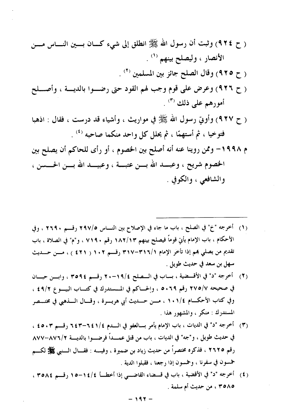 م 1998 - وممن روينا عنه أنه أصلح بين الخصوم، أو رأى للحاكم أن يصلح بين الخصوم شريح، وعبد الله بن عتبة، وعبيد الله بن الحسن، والشافعي، والكوفي.