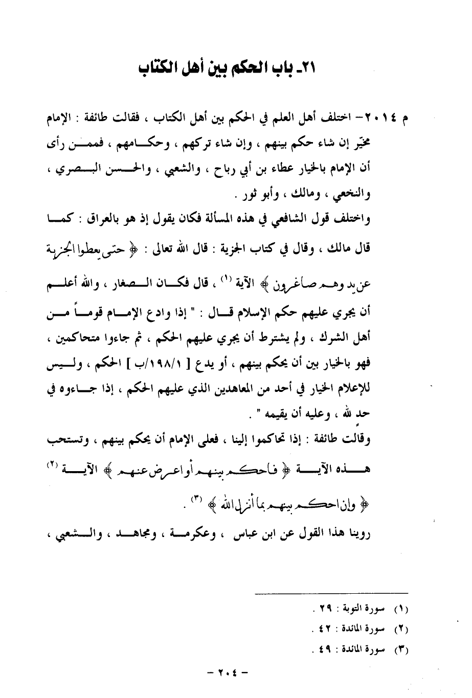 م 2014 - اختلف أهل العلم في الحكم بين أهل الكتاب، فقالت طائفة: الإمام مخيّر إن شاء حكم بينهم، وإن شاء تركهم، وحكامهم، فممن رأى أن الإمام بالخيار عطاء بن أبي رباح، والشعبي، والحسن البصري، والنخعي، ومالك، وأبو ثور.