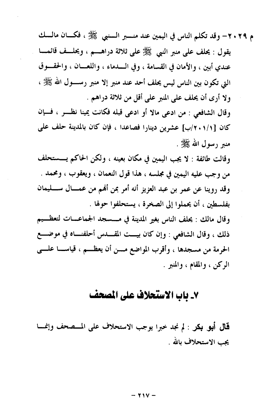 م 2029 - وقد تكلم الناس في اليمين عند منبر النبي - صلى الله عليه وسلم -، فكان مالك يقول: يحلف على منبر النبي - صلى الله عليه وسلم - على ثلاثة دراهم، ويحلف قائما عندي أبين، والأمان في القسامة، وفي الدماء، واللعان، والحقوق التي تكون بين الناس ليس يحلف أحد عند منبر إلا منبر رسول الله- صلى الله عليه وسلم -، ولا أرى أن يحلف على المنبر على أقل من ثلاثة دراهم.