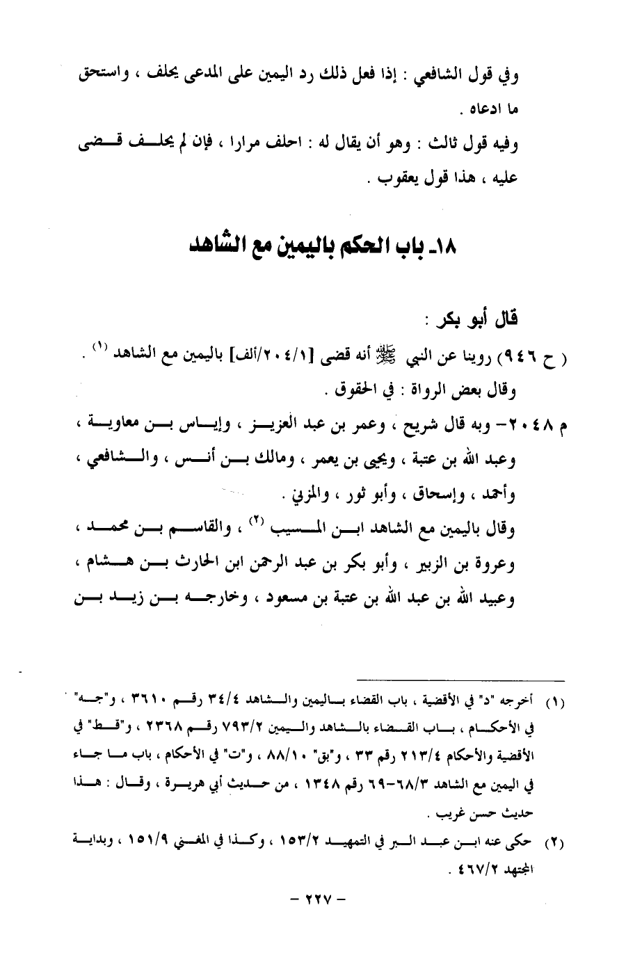 وقال باليمين مع الشاهد ابن المسيب، والقاسم بن محمد، وعروة بن الزبير، وأبو بكر بن عبد الرحمن ابن الحارث بن هشام، وعبيد الله بن عبد الله بن عتبة بن مسعود، وخارجه بن زيد بن