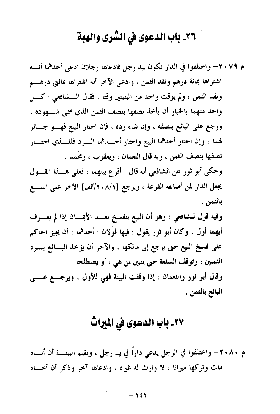 م 2080 - واختلفوا في الرجل يدعي داراً في يد رجل، ويقيم البينة أن أباه مات وتركها ميراثا، لا وارث له غيره، وادعاها آخر وذكر أن أخاه