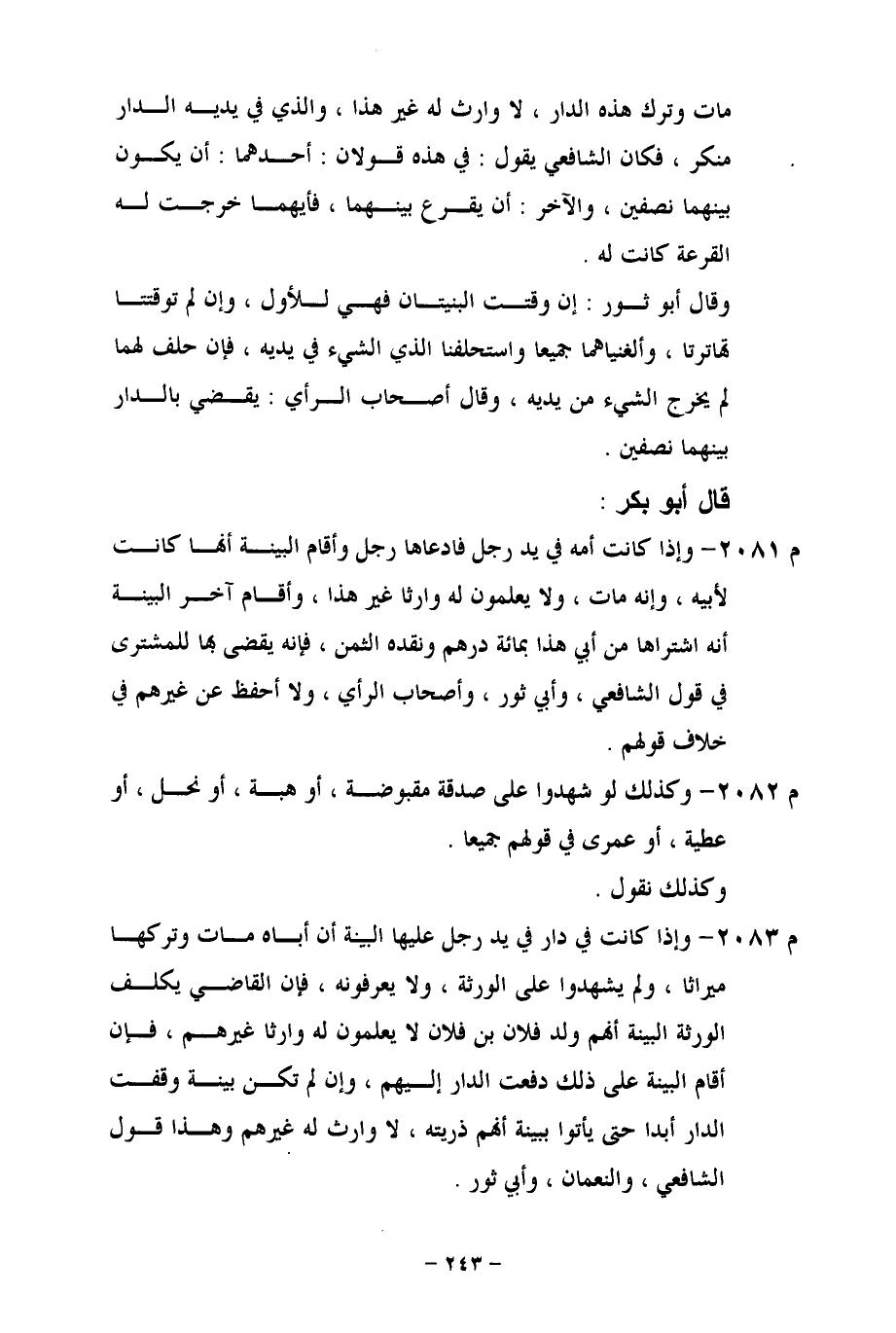 م 2083 - وإذا كانت في دار في يد رجل عليها البينة أن أباه مات وتركها ميراثا، ولم يشهدوا على الورثة، ولا يعرفونه، فإن القاضي يكلف الورثة البينة أنهم ولد فلان بن فلان لا يعلمون له وارثا غيرهم، فإن أقام البينة على ذلك دفعت الدار إليهم، وإن لم تكن بينة وقفت الدار أبدا حتى يأتوا ببينة أنهم ذريته، لا وارث له غيرهم وهذا قول الشافعي، والنعمان، وأبي ثور.