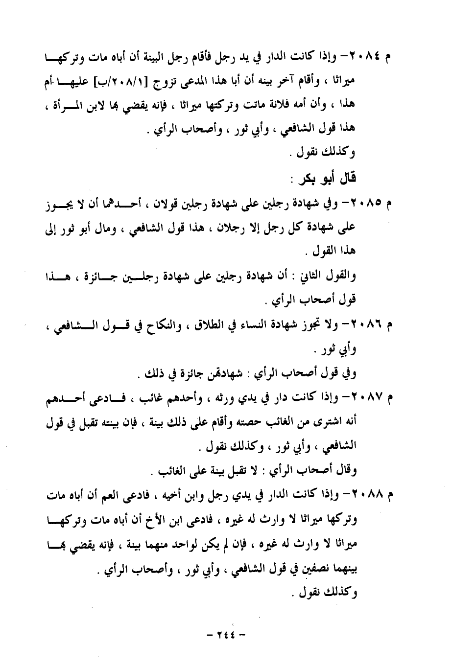 م 2084 - وإذا كانت الدار في يد رجل فأقام رجل البينة أن أباه مات وتركها ميراثا، وأقام آخر بينه أن أبا هذا المدعى تزوج [1/ 208/ب] عليها أم هذا، وأن أمه فلانة ماتت وتركتها ميراثا، فإنه يقضي بها لابن المرأة، هذا قول الشافعي، وأبي ثور، وأصحاب الرأي.