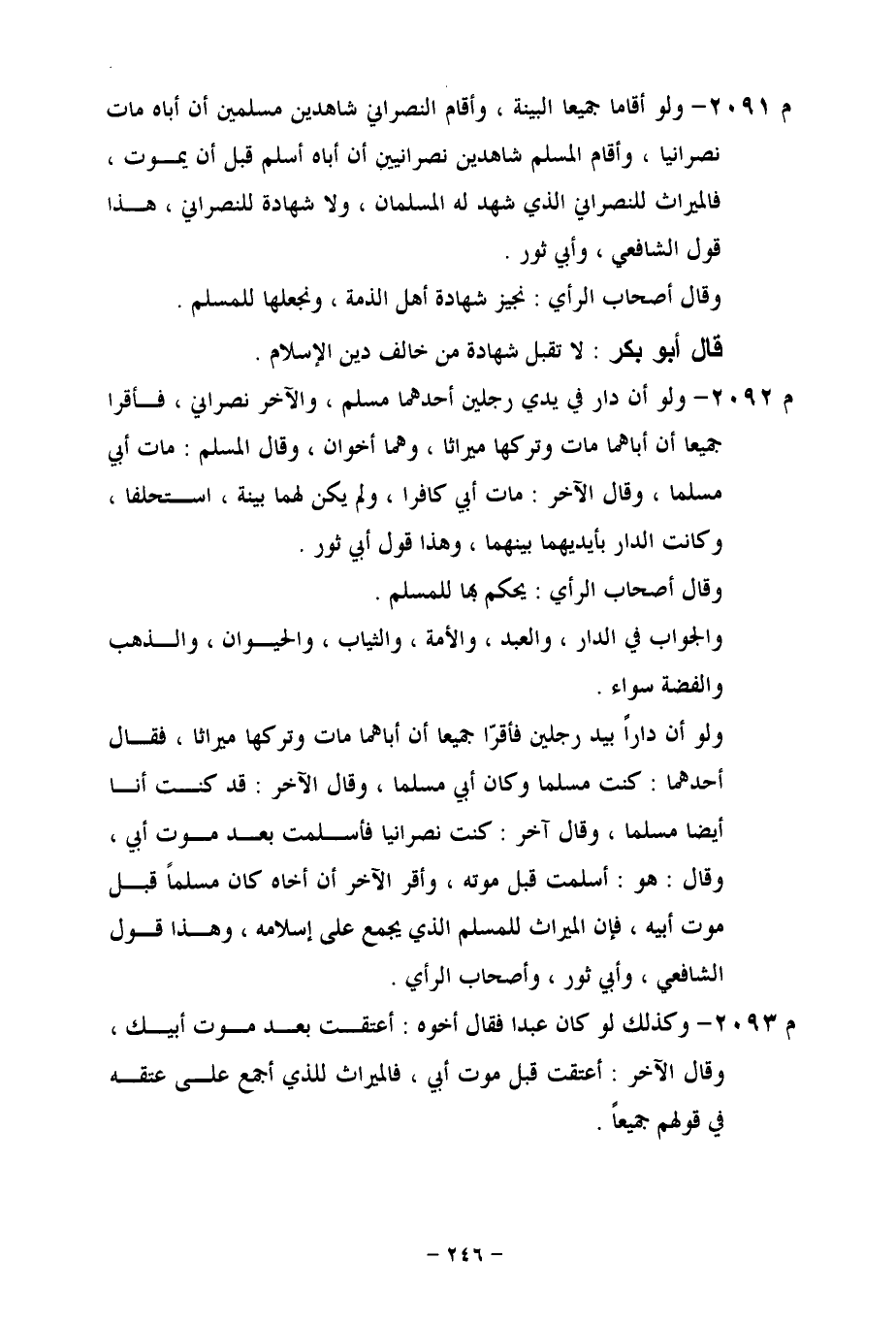 م 2091 - ولو أقاما جميعاً البينة، وأقام النصراني شاهدين مسلمين أن أباه مات نصرانيا، وأقام المسلم شاهدين نصرانيين أن أباه أسلم قبل أن يموت، فالميراث للنصراني الذي شهد له المسلمان، ولا شهادة للنصراني، هذا قول الشافعي، وأبي ثور.