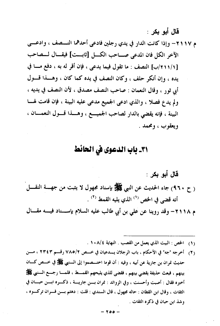 م 2117 - وإذا كانت الدار في يدي رجلين فادعى أحدهما النصف، وادعى الآخر الكل فإن المدعي صاحب الكل [ثابت] فيقال لصاحب [1/ 211/ب] النصف: ما تقول فيما يدعي، فإن أقر له به، دفع ما في يده، وإن أنكر حلف، وكان النصف في يده كان، وهذا قول أبي ثور، وقال النعمان: صاحب النصف مصدق؛ لأن النصف في يديه، ولم يدع فصل، والذي ادعى الجميع مدعى عليه البينة، فإن قامت لها البينة، فإنه يقضي بالدار لصاحب الجميع، وهذا قول النعمان، ويعقوب، ومحمد.