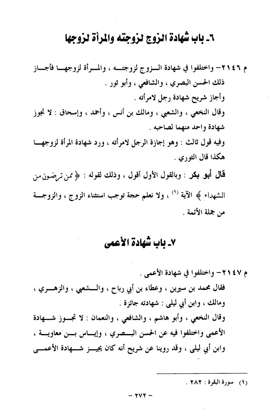 م 2146 - واختلفوا في شهادة الزوج لزوجته، والمرأة لزوجها فأجاز ذلك الحسن البصري، والشافعي، وأبو ثور.