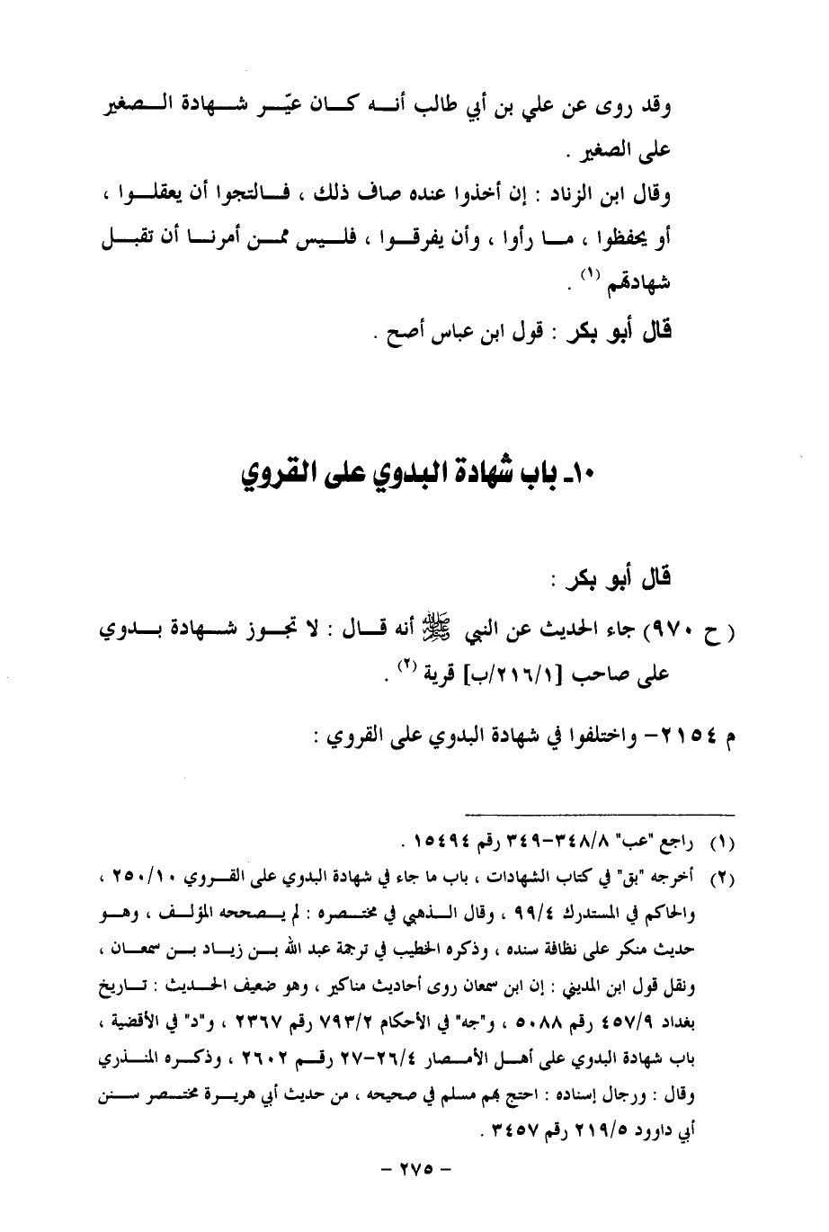 (ح 970) جاء الحديث عن النبي - صلى الله عليه وسلم - أنه قال: لا تجوز شهادة بدوي على صاحب [1/ 216/ب] قرية.