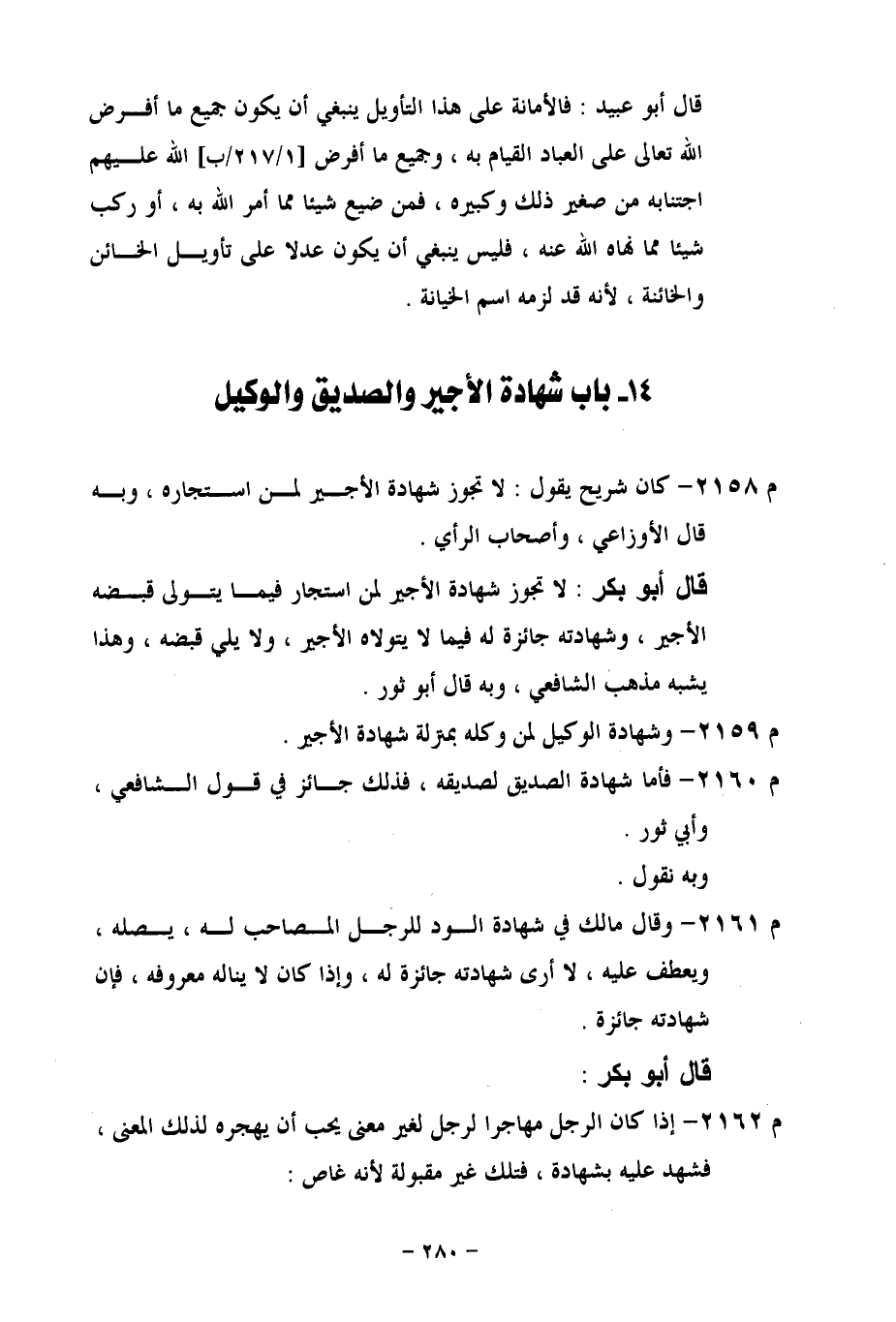 م 2158 - كان شريح يقول: لا تجوز شهادة الأجير لمن استجاره، وبه قال الأوزاعي، وأصحاب الرأي.