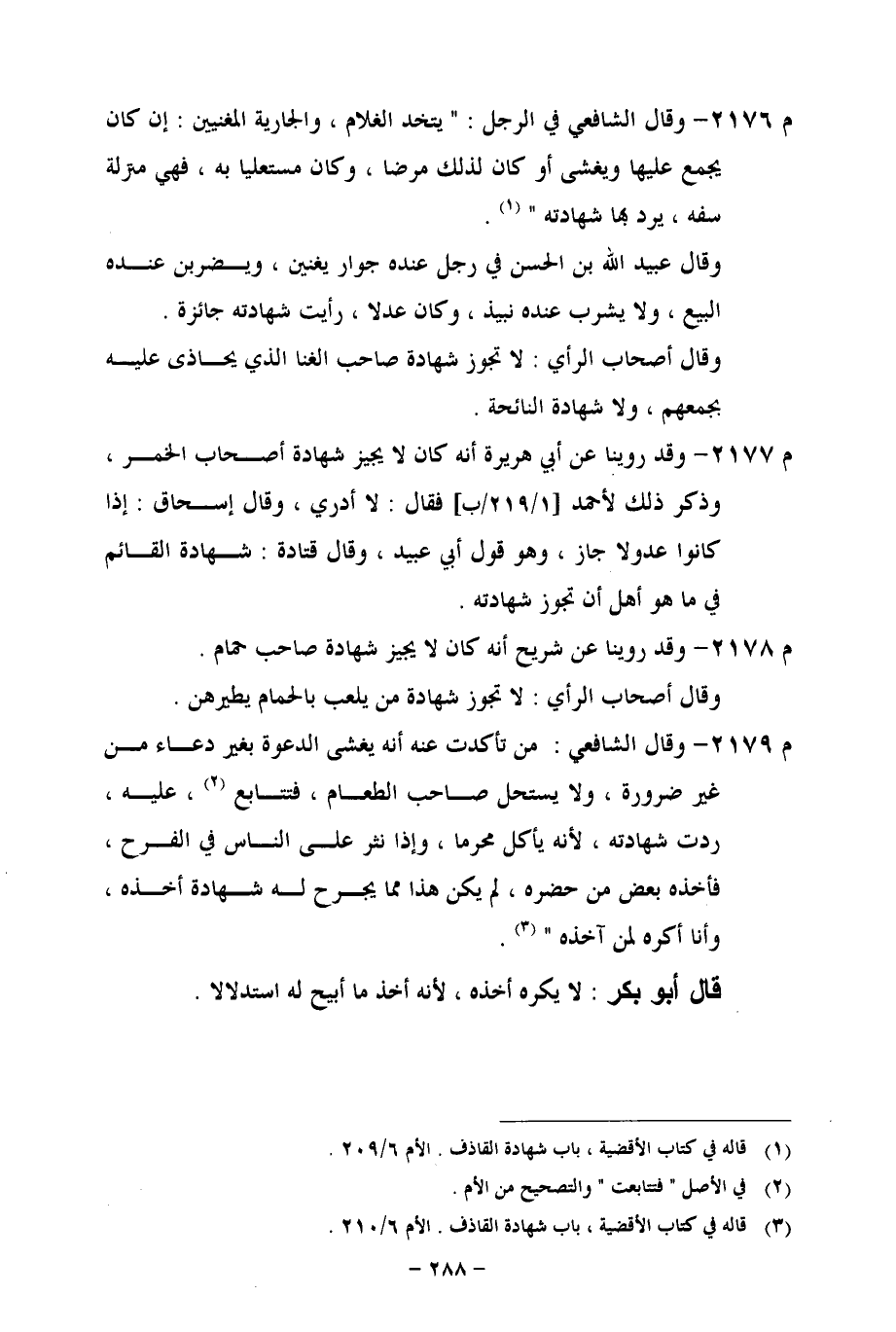 م 2176 - وقال الشافعي في الرجل: "يتخد الغلام، والجارية المغنيين: إن كان يجمع عليها ويغشى أو كان لذلك مرضا، وكان مستعليا به، في منزلة سفه، يردا شهادته".