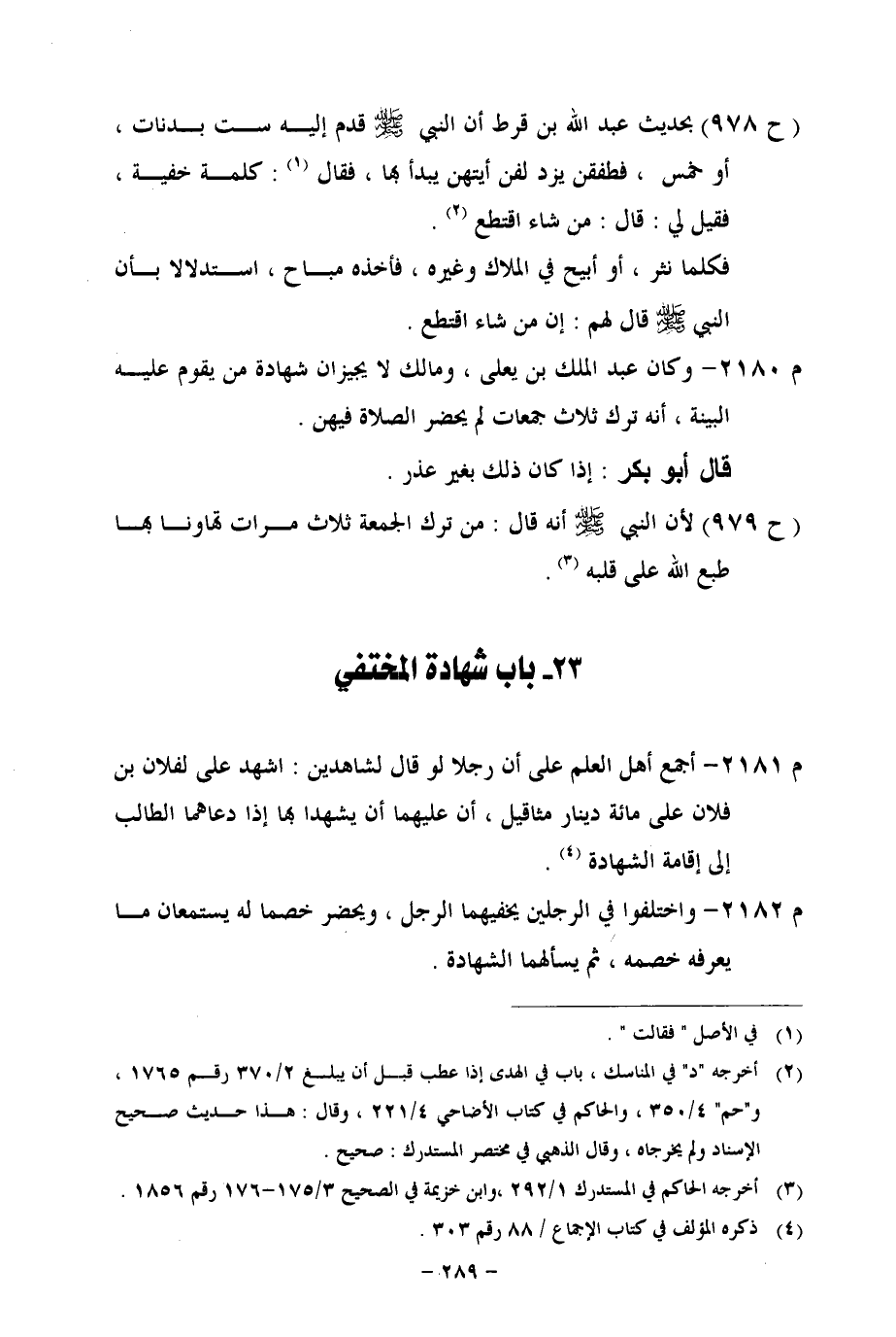 م 2180 - وكان عبد الملك بن يعلى، ومالك لا يجيزان شهادة من يقوم عليه البينة، أنه ترك ثلاث جمعات لم يحضر الصلاة فيهن.