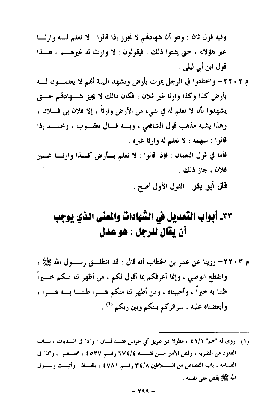 م 2202 - واختلفوا في الرجل يموت بأرض وتشهد البينة أنهم لا يعلمون له بأرض كذا وكذا وارثا غير فلان، فإن مالك لا يجيز شهادتهم حتى يشهدوا؟ بأنا لا نعلم له في شيء من الأرض وارثاً، إلا فلان بن فلان، وهذا يشبه مذهب قول الشافعي، وبه قال يعقوب، ومحمد إذا قالوا: سهمه، لا نعلم له وارثا غيره.