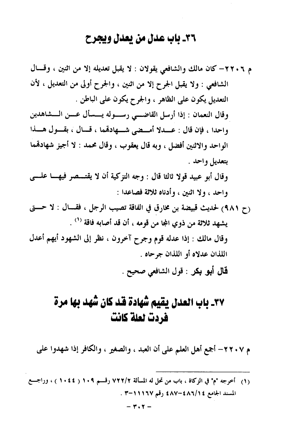 م 2206 - كان مالك والشافعي يقولان: لا يقبل تعديله إلا من اثنين، وقال الشافعي: ولا يقبل الجرح إلا من اثنين، والجرح أولى من التعديل، لأن التعديل يكون على الظاهر، والجرح يكون على الباطن.