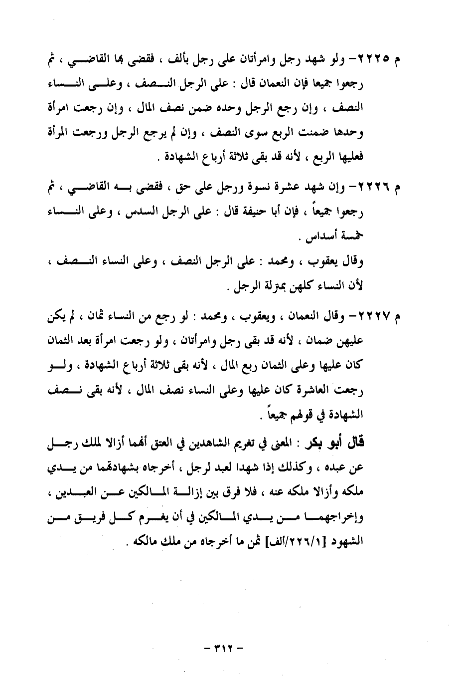 م 2225 - ولو شهد رجل وامرأتان على رجل بألف، فقضى القاضي، ثم رجعوا جميعاً فان النعمان قال: على الرجل النصف، وعلى النساء النصف، وإن رجع الرجل وحده ضمن نصف المال، وإن رجعت امرأة وحدها ضمنت الربع سوى النصف، وإن لم يرجع الرجل ورجعت المرأة فعليها الربع، لأنه قد بقى ثلاثة أرباع الشهادة.