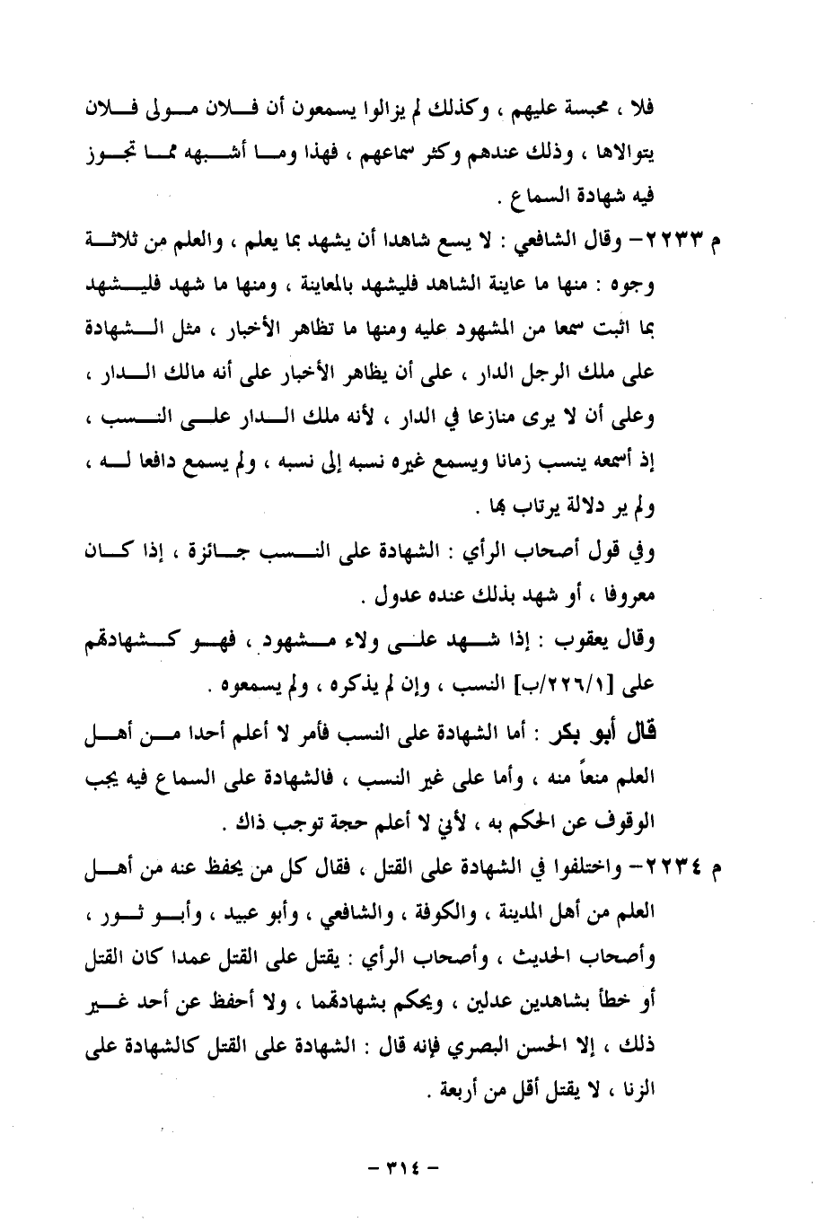 م 2233 - وقال الشافعي: لا يسع شاهدا أن يشهد بما يعلم، والعلم من ثلاثة وجوه: منها ما عاينة الشاهد فليشهد بالمعاينة، ومنها ما شهد فليشهد بما أثبت سمعا من المشهود عليه ومنها ما تظاهر الأخبار، مثل الشهادة على ملك الرجل الدار، على أن يظاهر الأخبار على أنه مالك الدار، وعلى أن لا يرى منازعا لي الدار، لأنه ملك الدار على النسب، إذ أسمعه ينسب زمانا ويسمع غيره نسبه إلى نسبه، ولم يسمع دافعا له، ولم ير دلالة يرتاب بها.