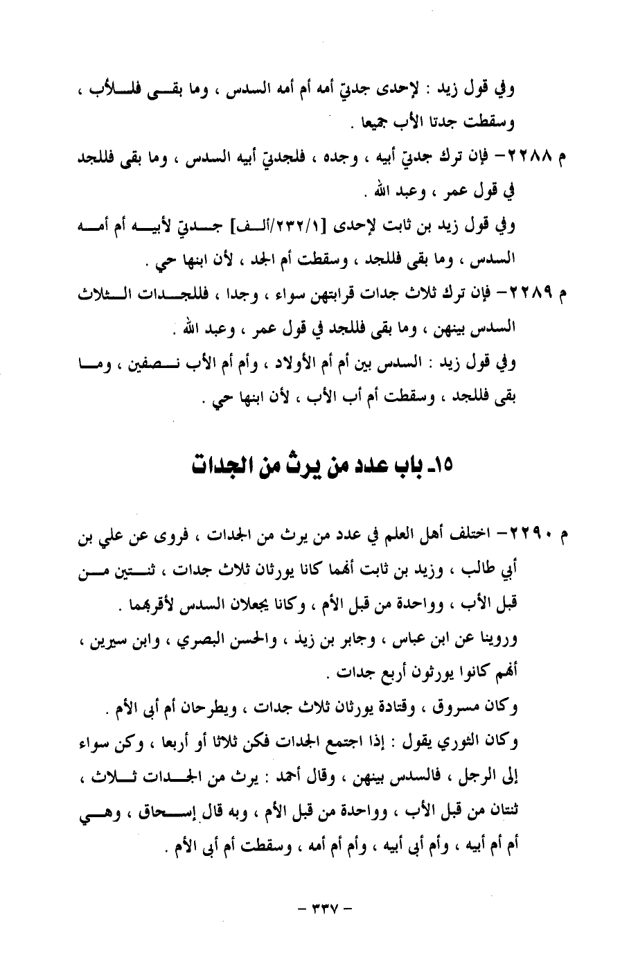 م 2290 - اختلف أهل العلم في عدد من يرث من الجدات، فروى عن علي بن أبي طالب، وزيد بن ثابت أنهما كانا يورثان ثلاث جدات، ثنتين من قبل الأب، وواحدة من قبل الأم، وكانا يجعلان السدس لأقربهما.