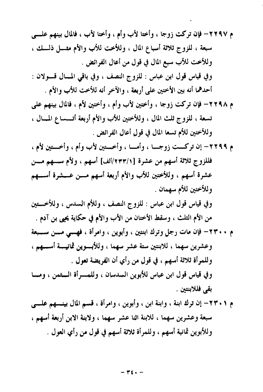 م 2300 - فإن مات رجل وترك ابنتين، وأبوين، وامرأة، فهي من سبعة وعشرين سهما، للابنتين ستة عشر سهما، وللأبوين ثمانية أسهم، وللمرأة ثلاثة أسهم، في قول من رأي أن الفريضة تعول.