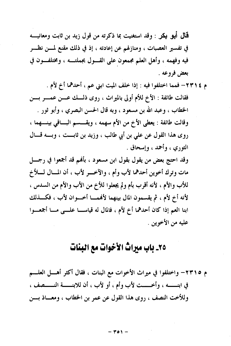 م 2315 - واختلفوا في ميراث الأخوات مع البنات، فقال أكثر أهل العلم في ابنه، وأخت لأب وأم، أو لأب، أن للابنة النصف، وللأخت النصف، روى هذا القول عن عمر بن الخطاب، ومعاذ بن