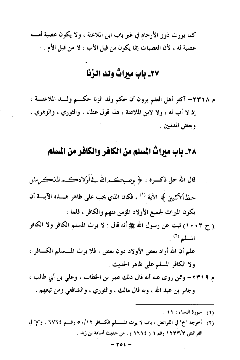 م 2318 - أكثر أهل العلم يرون أن حكم ولد الزنا حكم ولد الملاعنة، إذ لا [[أرث]] له، ولا لابن الملاعنة، هذا قول عطاء، والثوري، والزهري، وبعض المدنيين.