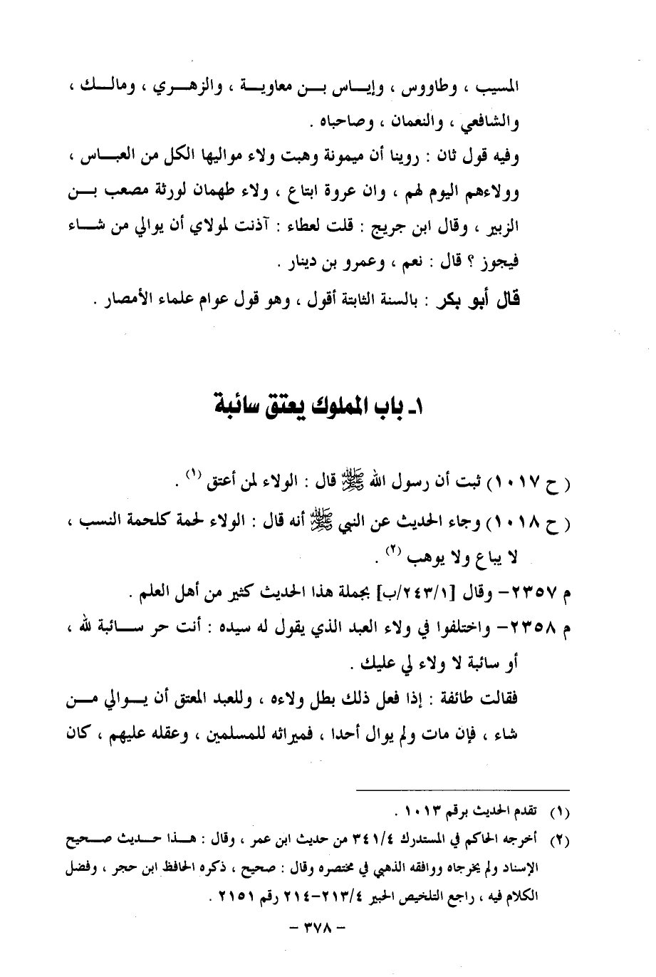 (ح 1018) وجاء الحديث عن النبي - صلى الله عليه وسلم - أنه قال: الولاء لحمة كلحمة النسب، لا يباع ولا يوهب.