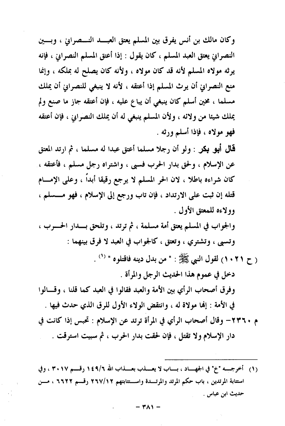 وكان مالك بن أنس يفرق بين المسلم يعتق العبد النصراني، وبين النصراني يعتق العبد المسلم، كان يقول: إذا أعتق المسلم النصراني، فإنه يرثه مولاه المسلم لأنه قد كان مولاه، ولأنه كان يصلح له بملكه، وإنما منع النصراني أن يرث المسلم إذا أعتقه؛ لأنه لا ينبغي للنصراني أن يملك مسلما، من [[فحين]] أسلم كان ينبغي أن يباع عليه، فان أعتقه جاز ما صنع ولم يملك شيئا من ولأئه، ولأن المسلم ينبغي له أن يملك النصراني، فإن أعتقه فهو مولاه، إذا أسلم ورثه.