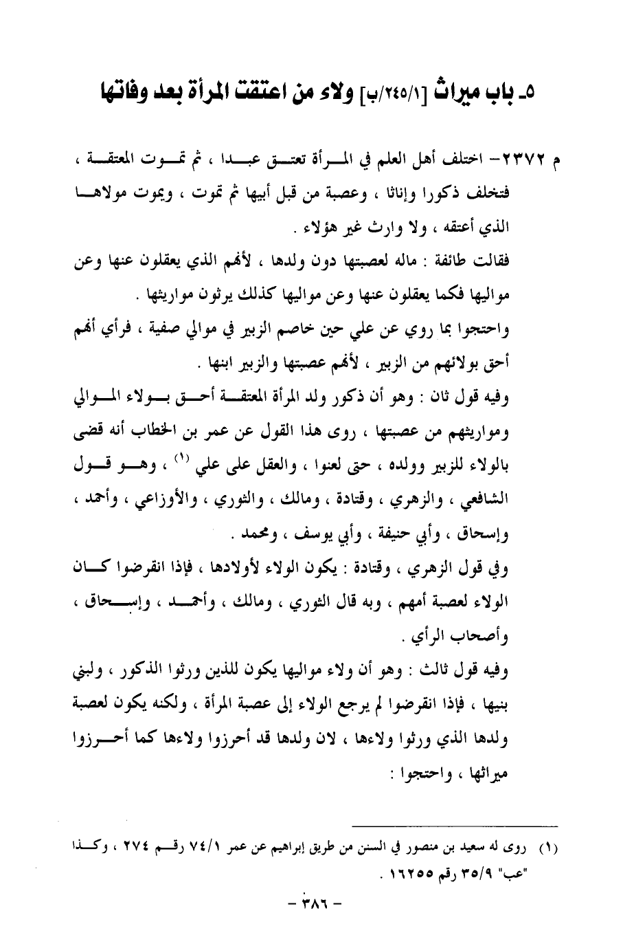 م 2372 - اختلف أهل العلم في المرأة تعتق عبدا، ثم تموت المعتقة، فتخلف ذكورا وإناثا، وعصبة من قبل أبيها ثم تموت، ويموت مولاها الذي أعتقه، ولا وارث غير هؤلاء.