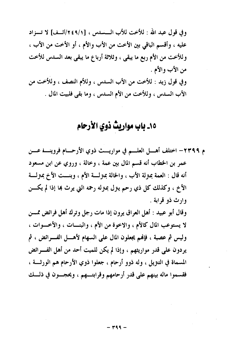 م 2399 - اختلف أهل العلم في مواريث ذوي الأرحام فروينا عن عمر بن الخطاب أنه قسم المال بين عمة، وخالة، وروي عن ابن مسعود أنه قال: العمة بمنزلة الأب، والخالة بمنزلة الأم، وبنت الأخ بمنزلة الأخ، وكذلك كل ذي رحم ينزل بمنزله رحمه التي يرث بها إذا لم يكن وارث ذو قرابة.