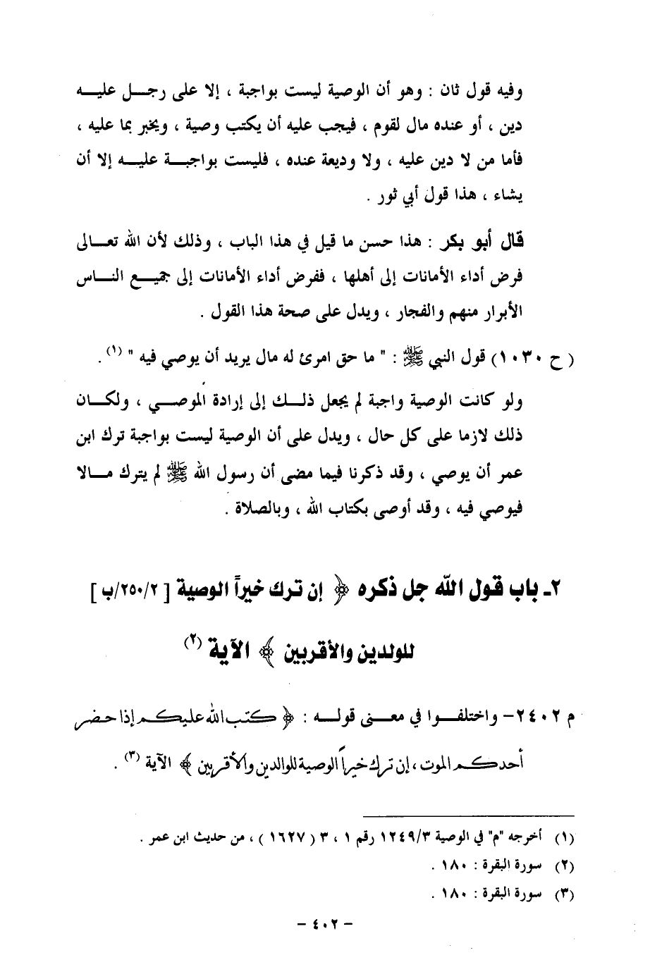 م 2402 - واختلفوا في معنى قوله: {كُتِبَ عَلَيْكُمْ إِذَا حَضَرَ أَحَدَكُمُ الْمَوْتُ إِنْ تَرَكَ خَيْرًا الْوَصِيَّةُ لِلْوَالِدَيْنِ وَالْأَقْرَبِينَ} الآية.