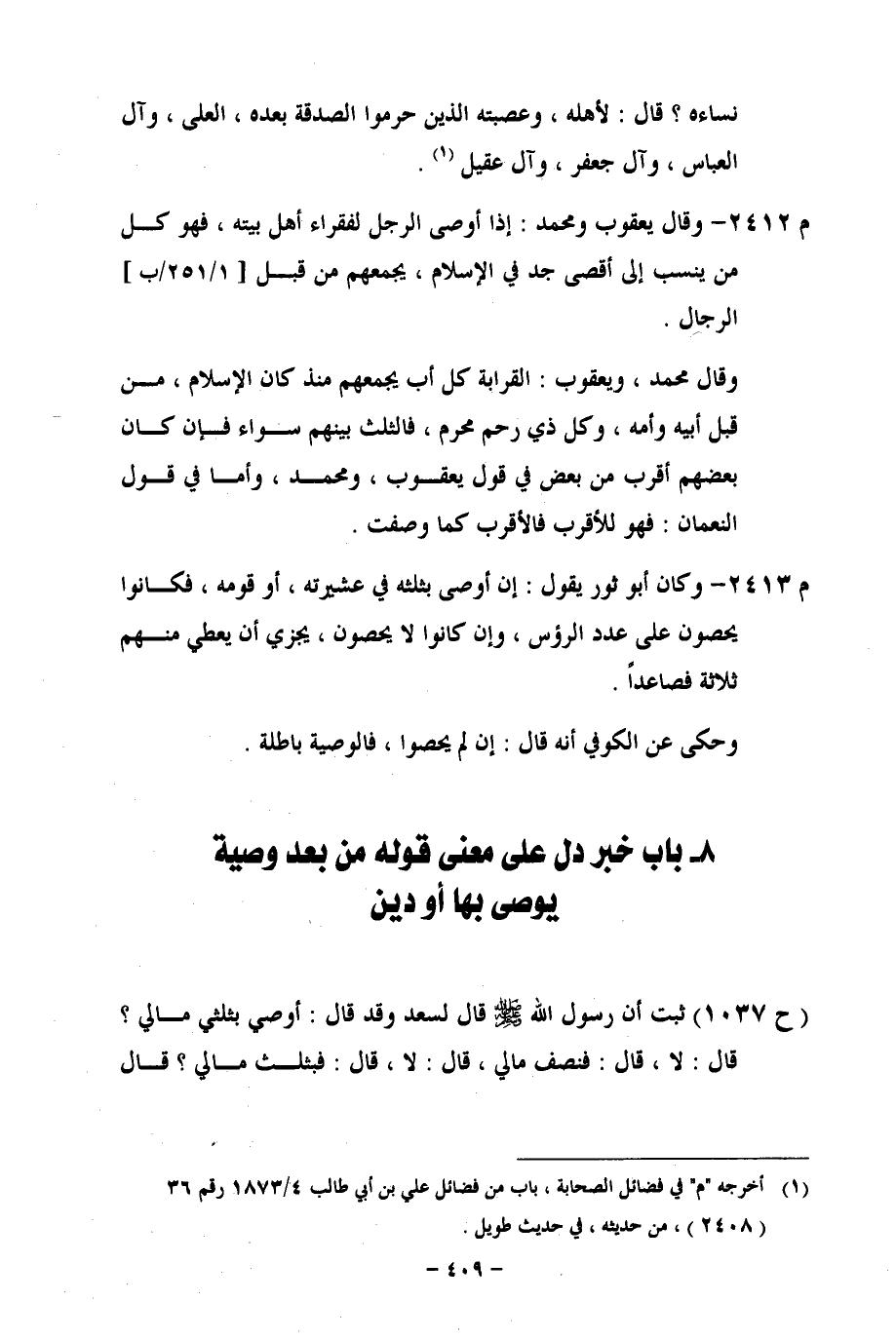 (ح 1037) ثبت أن رسول الله- صلى الله عليه وسلم - قال لسعد وقد قال: أوصي بثلثي مالي؟ قال: لا، قال: فنصف مالي، قال: لا، قال: فبثلث مالي؟ قال