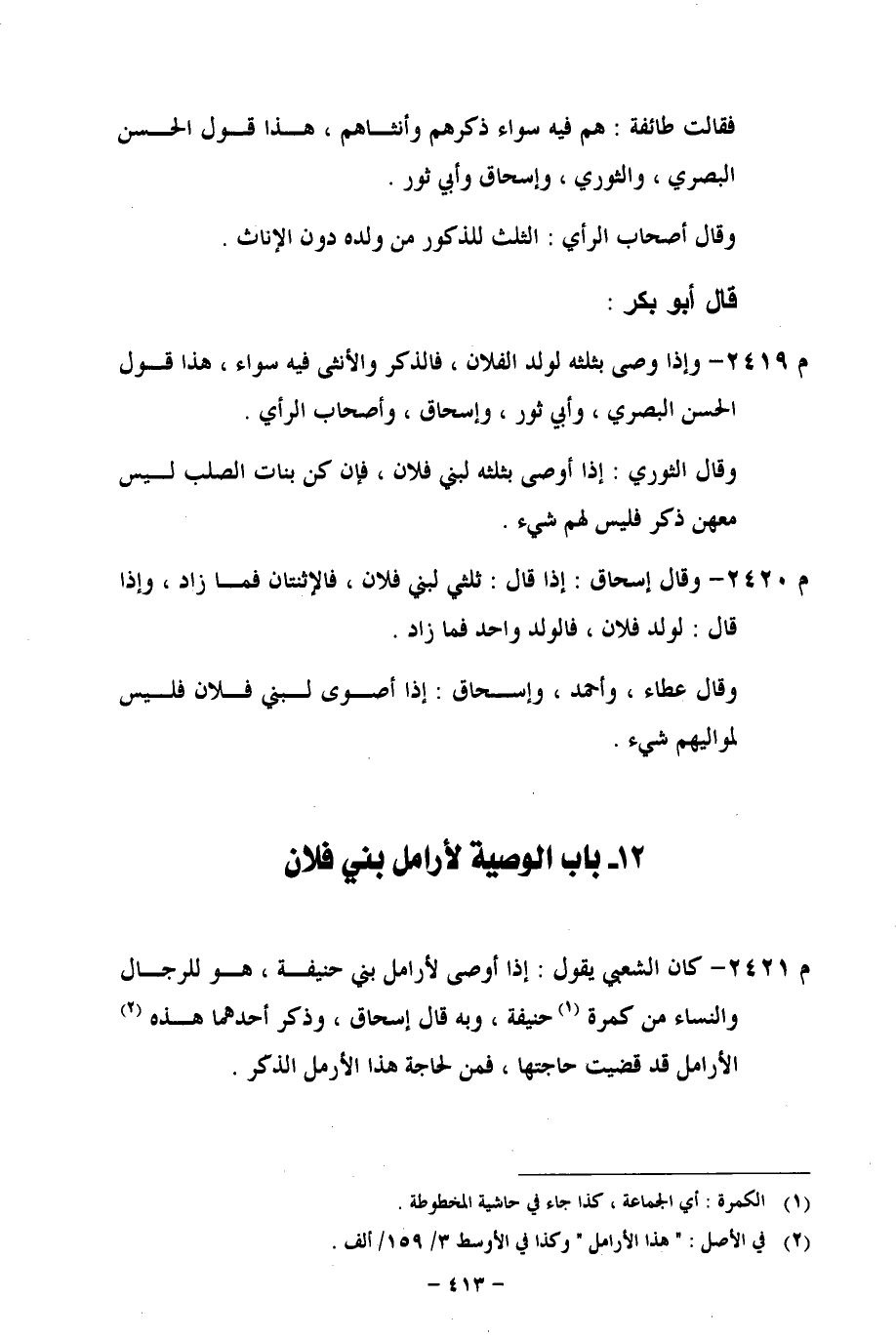 م 2421 - كان الشعبي يقول: إذا أوصى لأرامل بني حنيفة، هو للرجال والنساء من كمرة (¬1) حنيفة، وبه قال إسحاق، وذكر أحدهما: