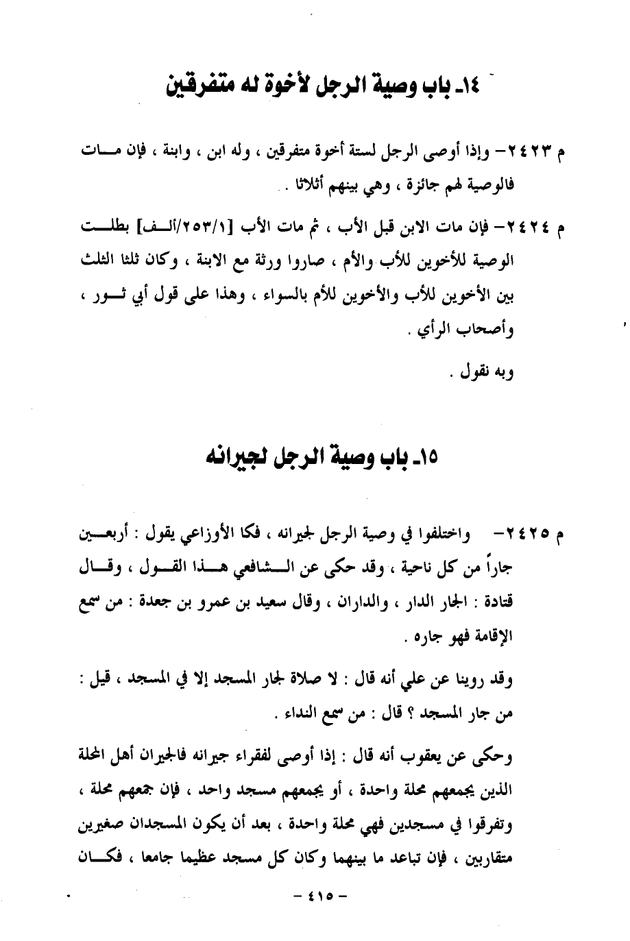 م 2425 - واختلفوا في وصية الرجل لجيرانه، فكان الأوزاعي يقول: أربعين جاراً من كل ناحية، وقد حكى عن الشافعي هذا القول، وقال قتادة: الجار الدار والداران، وقال سعيد بن عمرو بن جعدة: من سمع الإقامة فهو جاره.