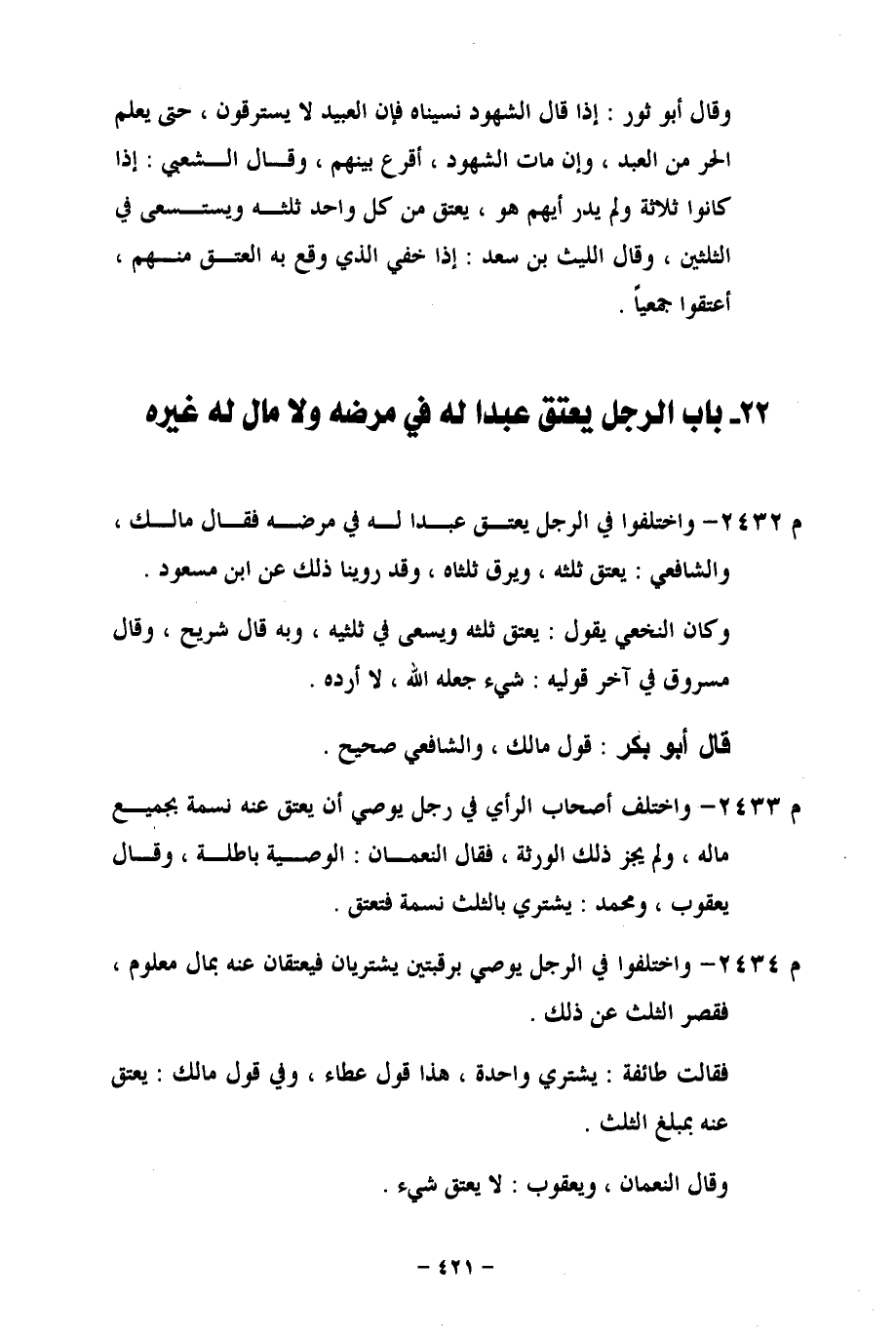 م 2432 - واختلفوا في الرجل يعتق عبدا له في مرضه فقال مالك، والشافعي: يعتق ثلثه، ويرق ثلثاه، وقد روينا ذلك عن ابن مسعود.