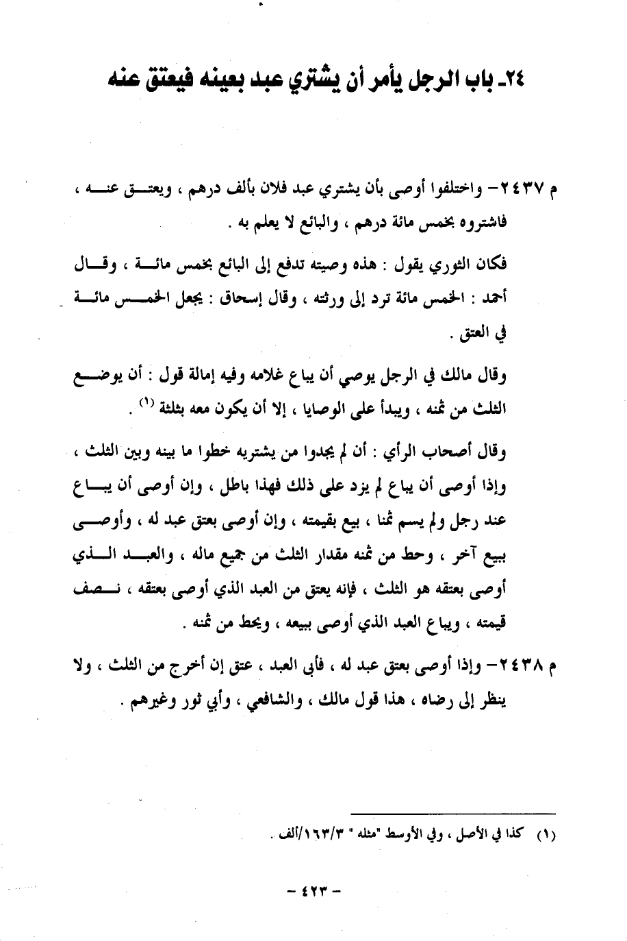 م 2438 - وإذا أوصى بعتق عبد له، فأبى العبد، عتق إن أخرج من الثلث، ولا ينظر إلى رضاه، هذا قول مالك، والشافعي، وأبي ثور وغيرهم.