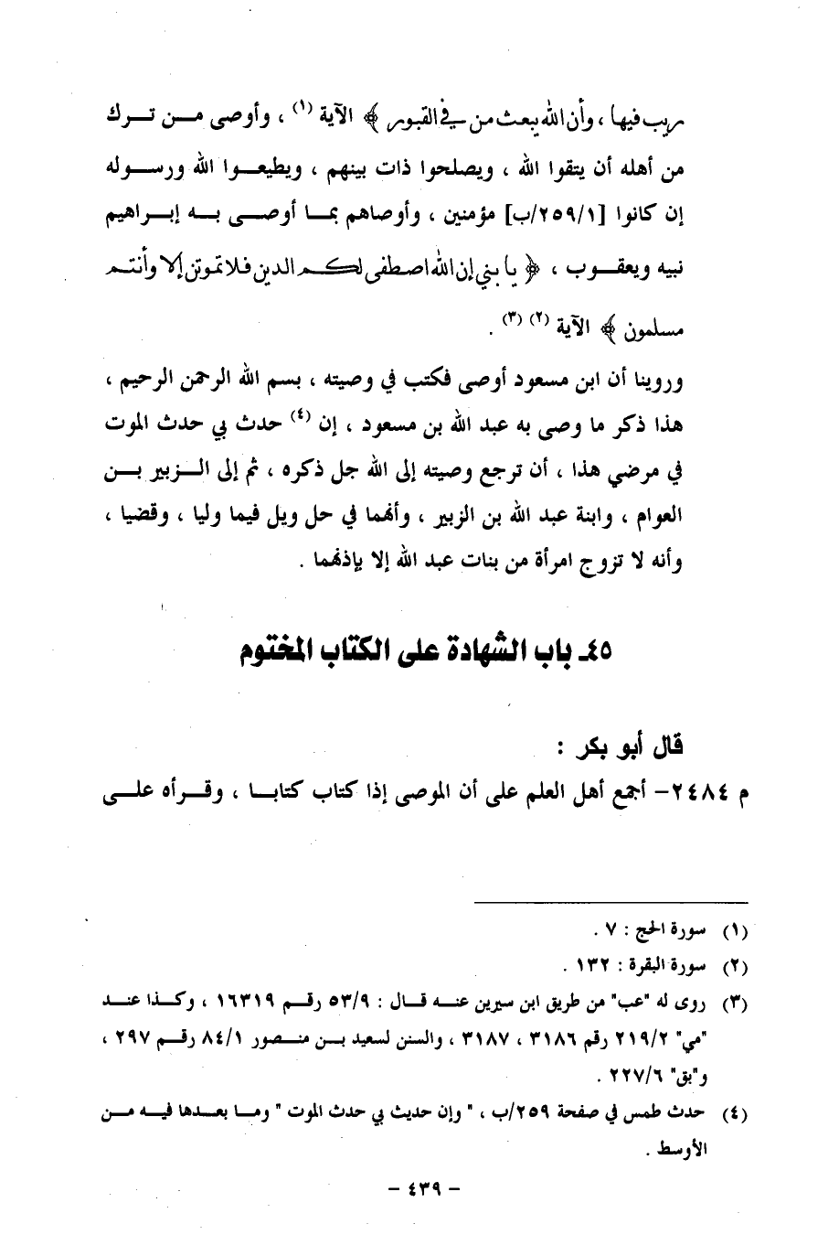 وروينا أن ابن مسعود أوصى فكتب في وصيته، بسم الله الرحمن الرحيم، هذا ذكر ما وصى به عبد الله بن مسعود،. . . . . . . . . (¬1)