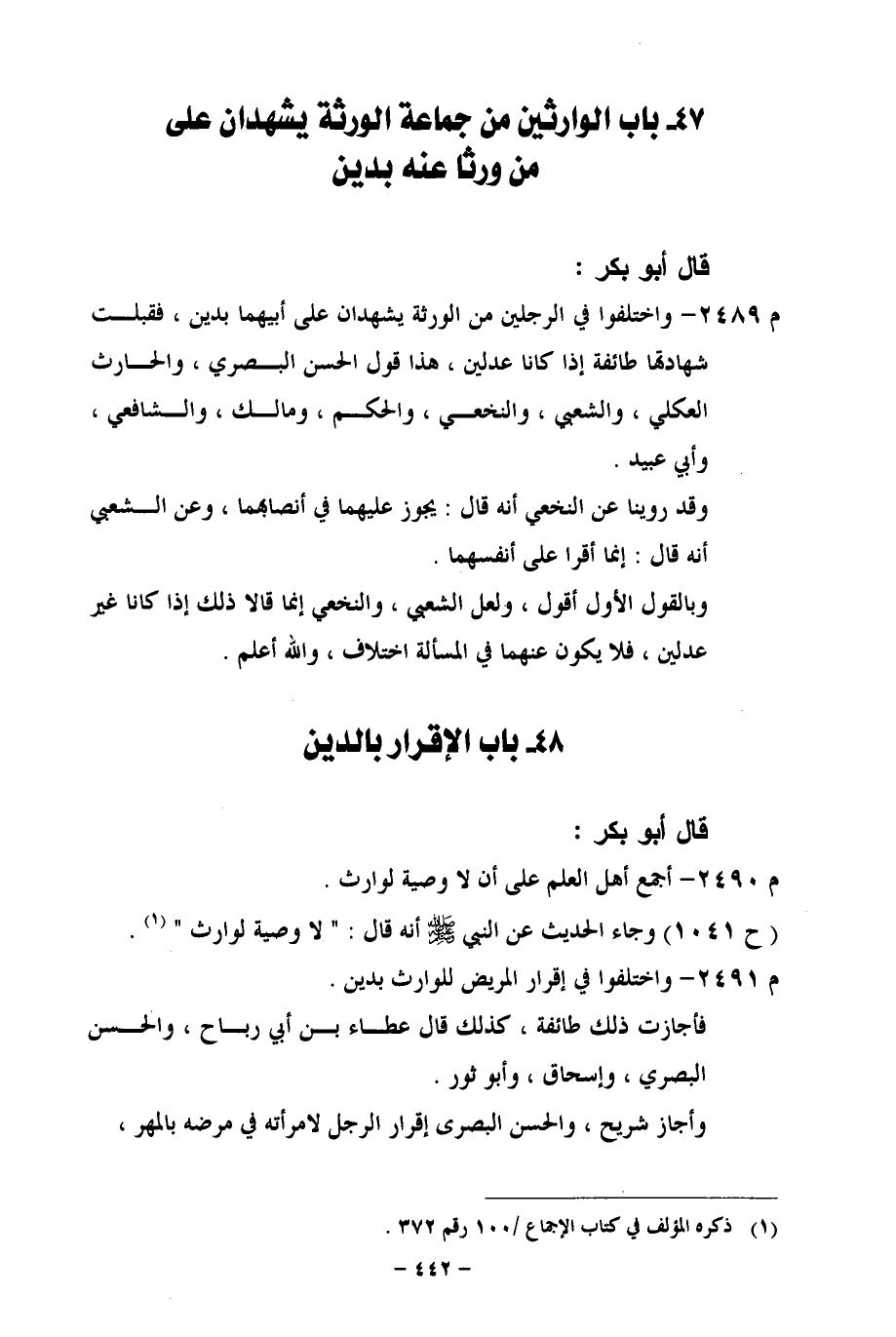 م 2489 - واختلفوا في الرجلين من الورثة يشهدان على أبيهما بدين، فقبلت شهادتها طائفة إذا كانا عدلين، هذا قول الحسن البصري، والحارث العكلي، والشعبي، والنخعي، والحكم، ومالك، والشافعي، وأبي عبيد.