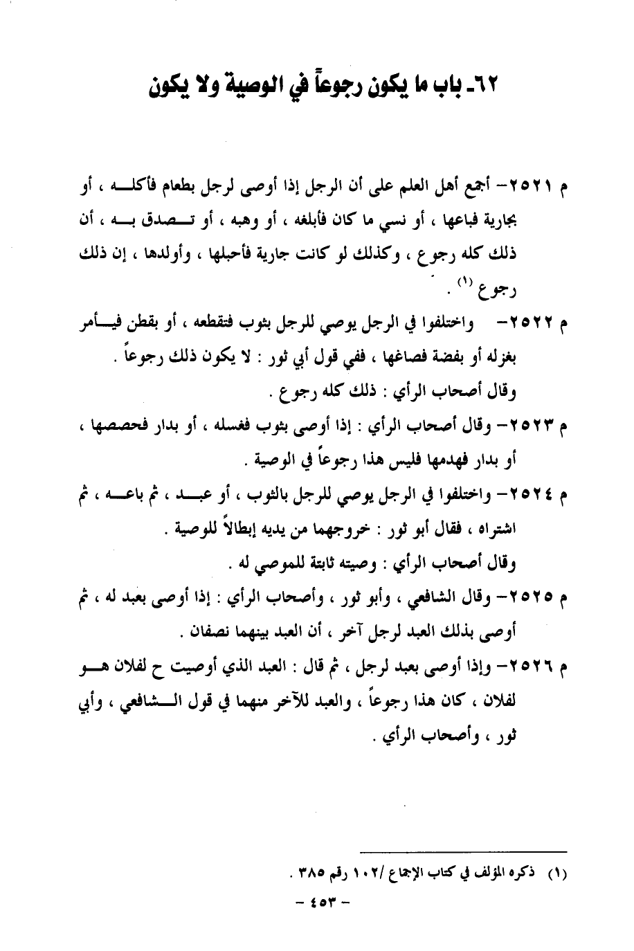 م 2522 - واختلفوا في الرجل يوصي للرجل بثوب فتقطعه، أو بقطن فيأمر بغزله أو بفضة فصاغها، ففي قول أبي ثور: لا يكون ذلك رجوعاً.