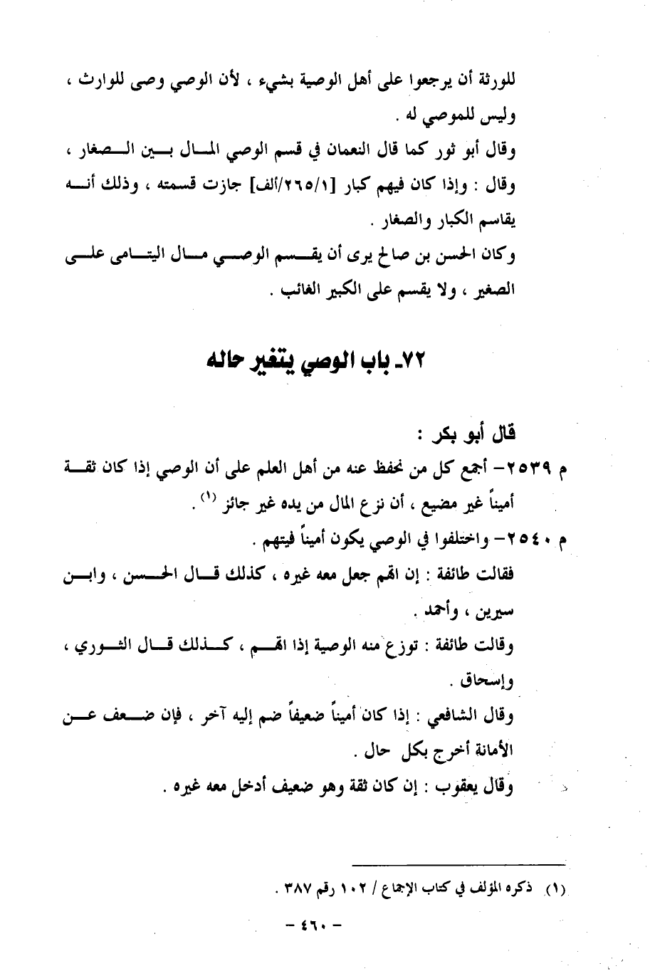 وكان الحسن بن صالح يرى أن يقسم الوصي مال اليتامى على الصغير، ولا يقسم على الكبير الغائب.