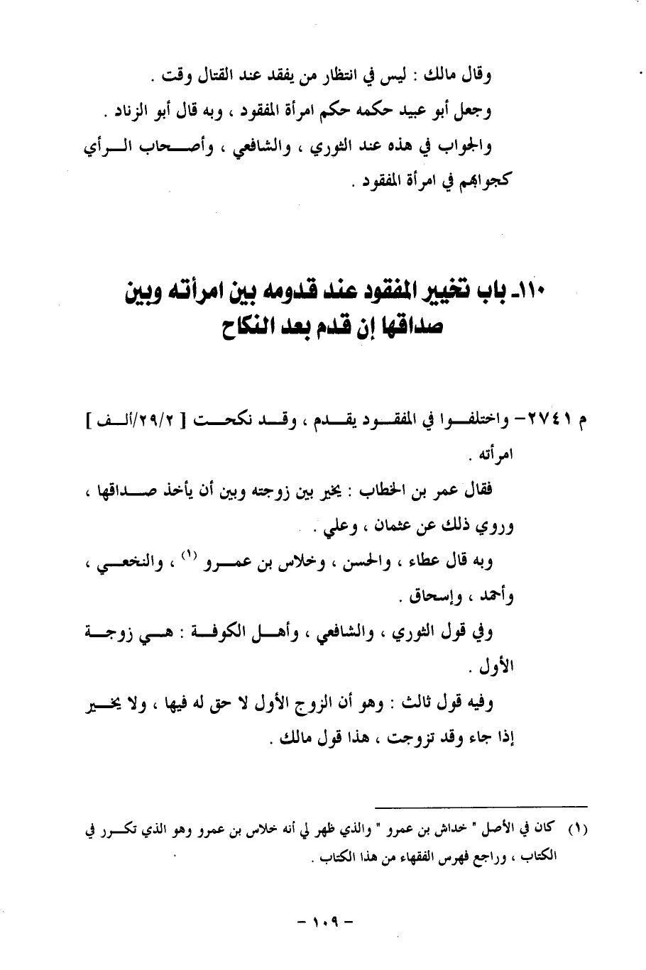 110 - باب تخيير المفقود عند قدومه بين امرأته وبين صداقها إن قدم بعد النكاح