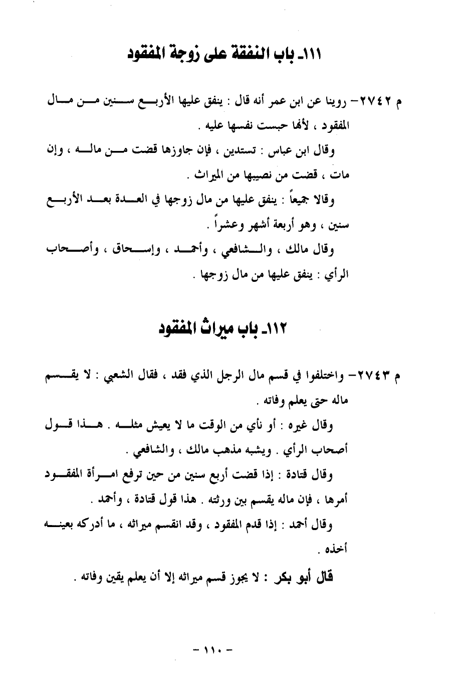 م 2743 - واختلفوا في قسم مال الرجل الذي فقد، فقال الشعبي: لا يقسم ماله حتى يعلم وفاته.
