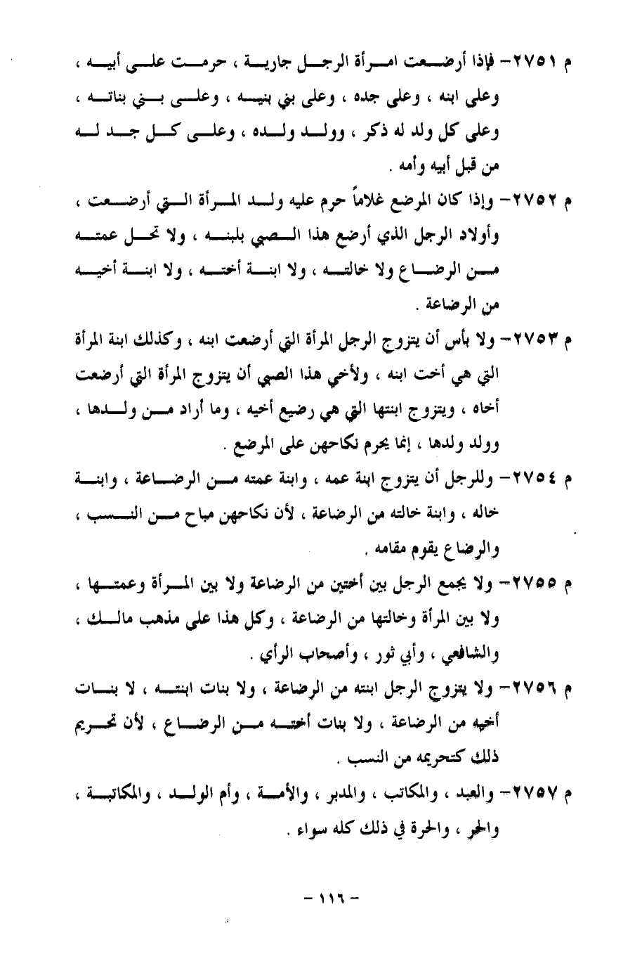 م 2755 - ولا يجمع الرجل بين أختين من الرضاعة ولا بين المرأة وعمتها، ولا بين المرأة وخالتها من الرضاعة، وكل هذا على مذهب مالك، والشافعي، وأبي ثور، وأصحاب الرأي.