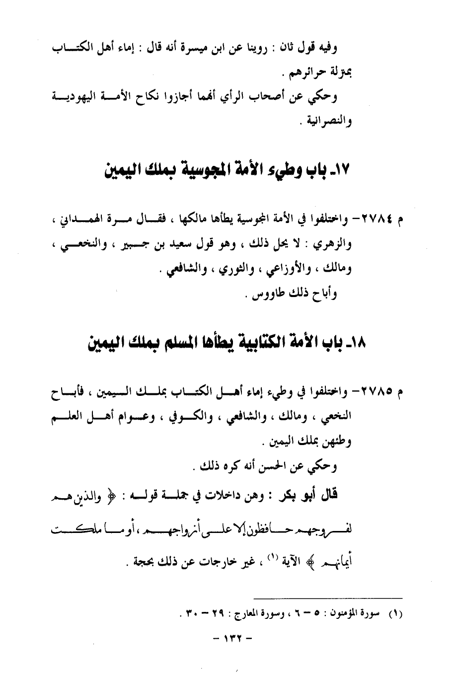 م 2785 - واختلفوا في وطيء إماء أهل الكتاب بملك اليمين، فأباح النخعي، ومالك، والشافعي، والكوفي، وعوام أهل العلم وطئهن بملك اليمين.