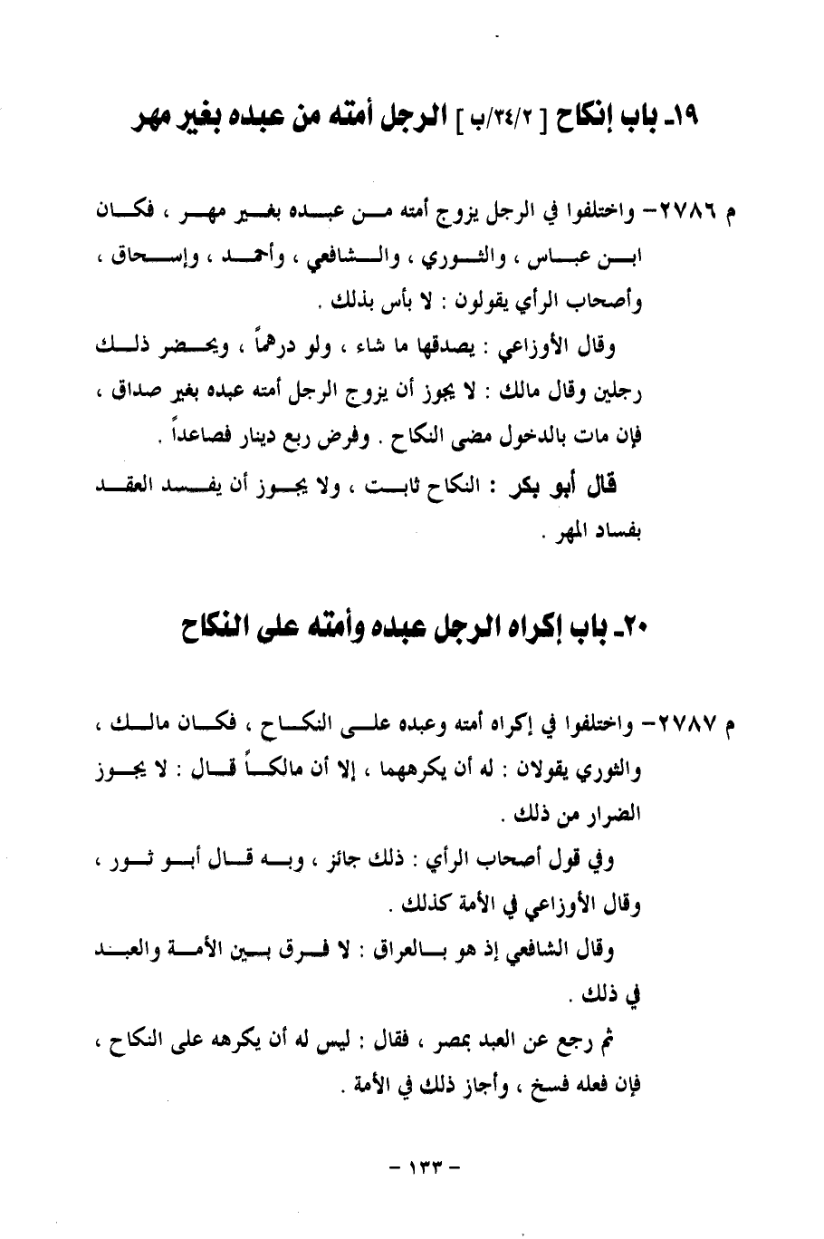 م 2786 - واختلفوا في الرجل يزوج أمته من عبيده بغير مهر، فكان ابن عباس، والثوري، والشافعي، وأحمد، وإسحاق، وأصحاب الرأي يقولون: لا بأس بذلك.