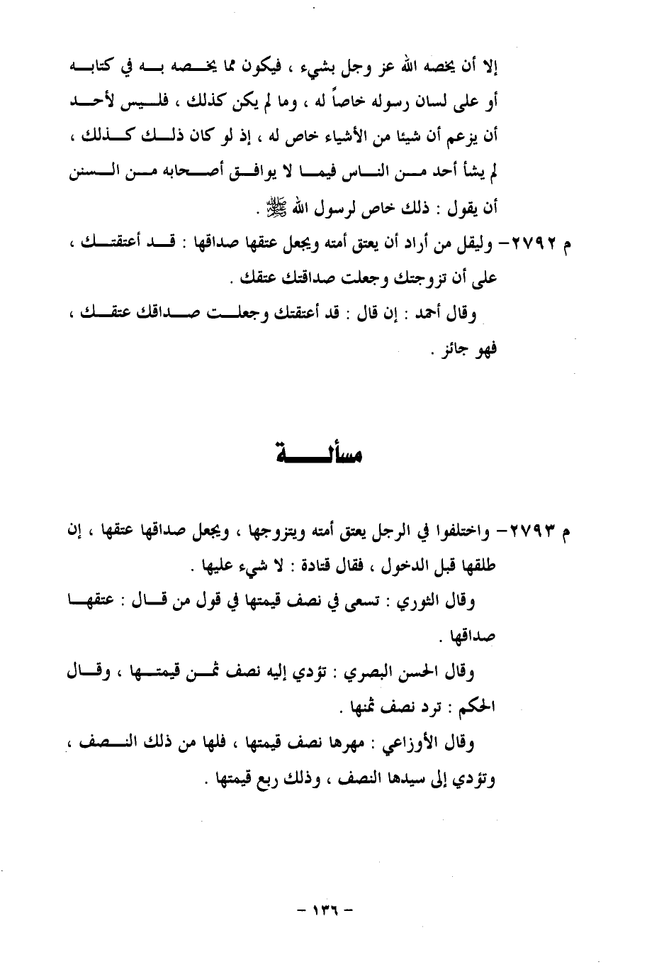 م 2793 - واختلفوا في الرجل يعتق أمته ويتزوجها، ويجعل صداقها عتقها، إن طلقها قبل الدخول، فقال قتادة: لا شيء عليها.
